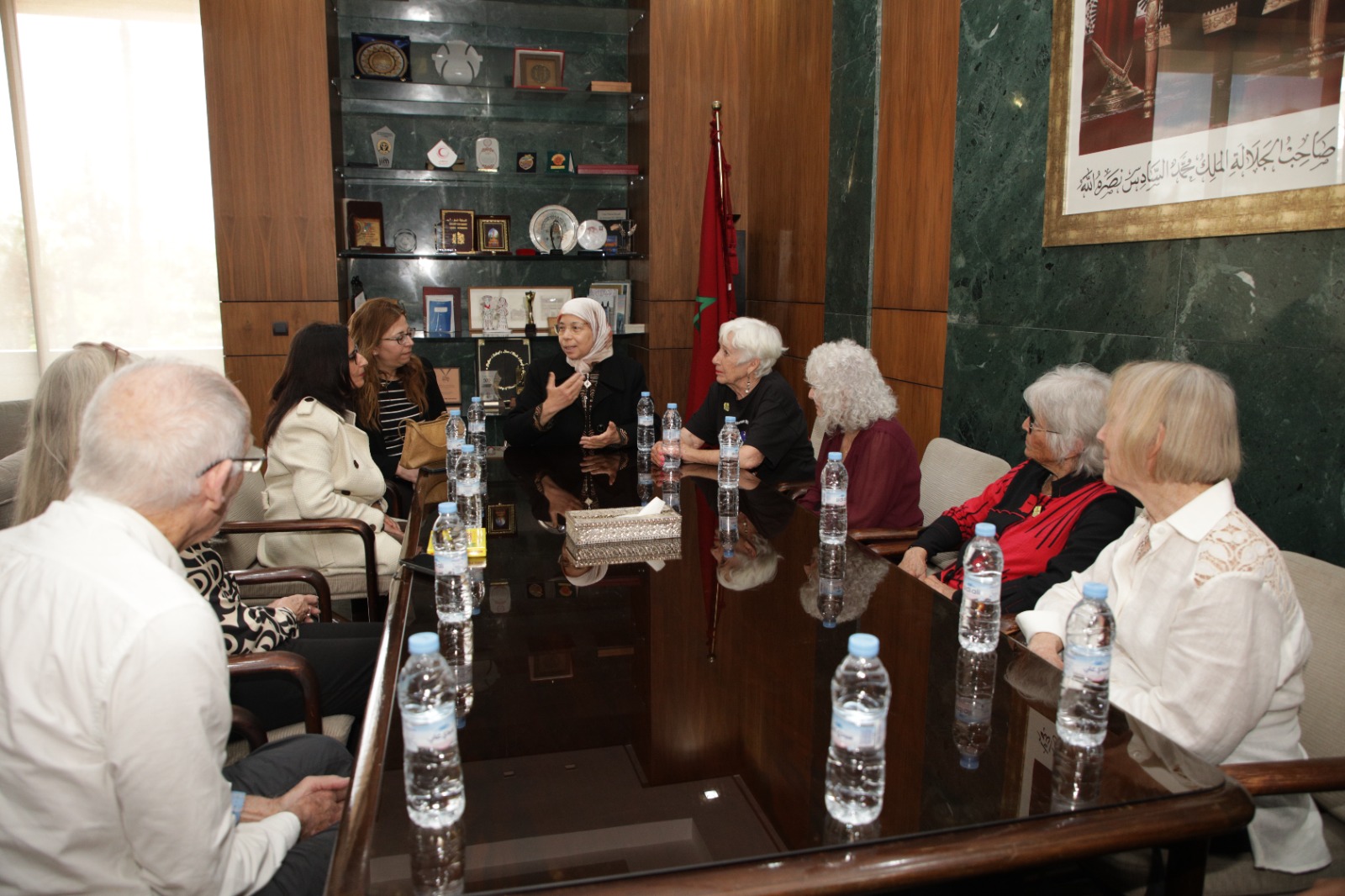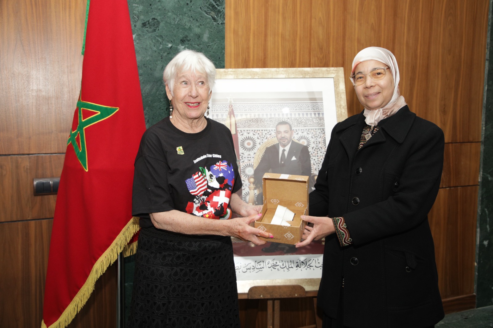 Au nom de Mme Fatim Ezzahra EL MANSOURI, présidente du Conseil communal de Marrakech, Mme Khadija BOUHRACHI, 5ème Vice présidente du Conseil Communal de Marrakech, a reçu, le jeudi 26 mars 2026, à l'hôtel de ville de Marrakech, une délégation américaine de la ville de Scottsdale, composée de plusieurs membres de l’Association Scottsdale–Marrakech des villes jumelées. Parmi eux figuraient notamment Mme Kathy George, cheffe de la délégation, et M. David Ortega, ancien maire de Scottsdale.
