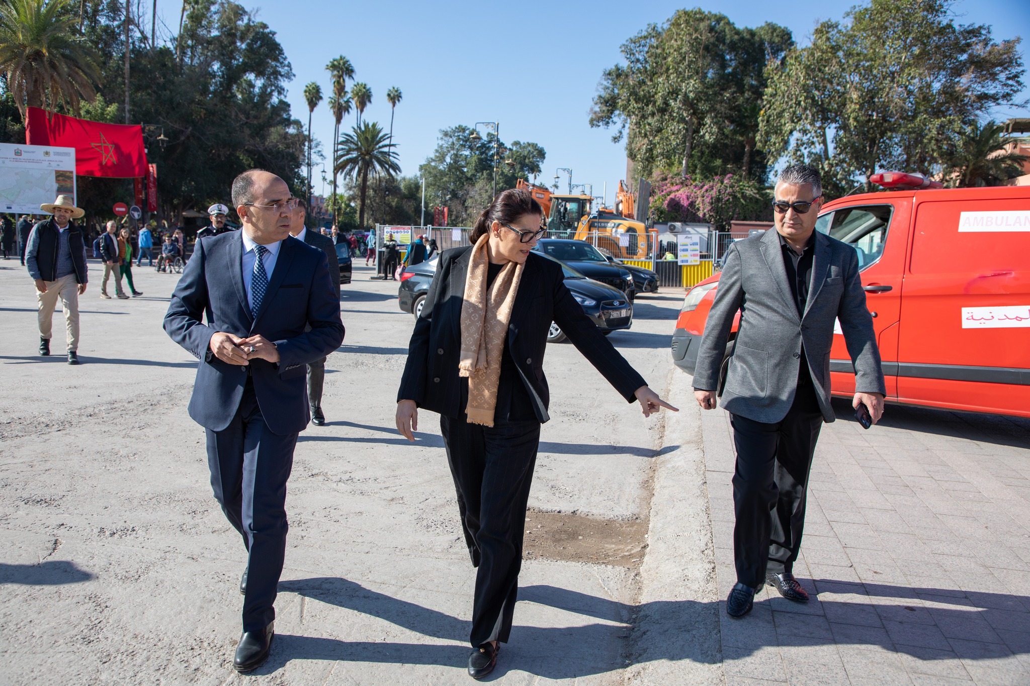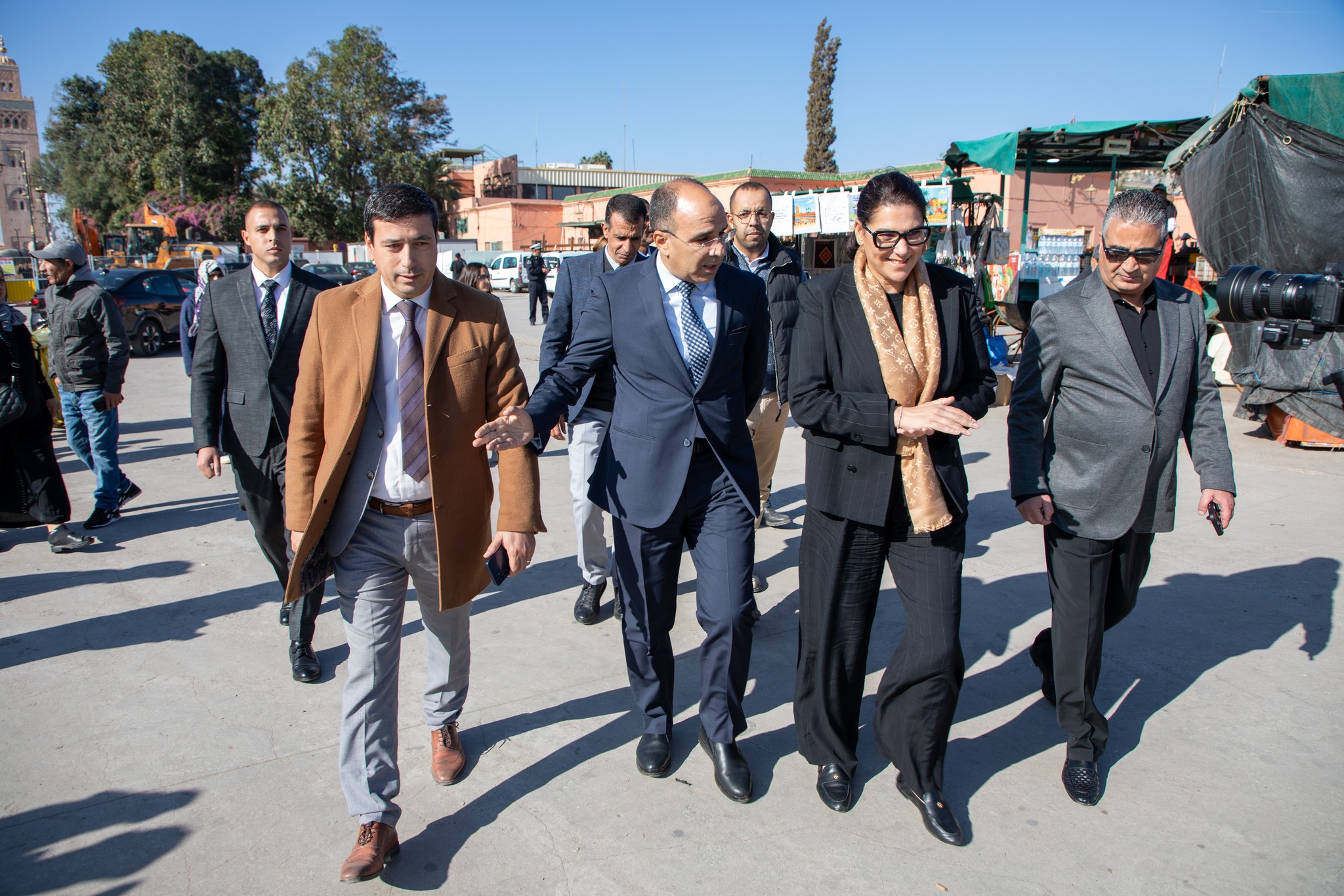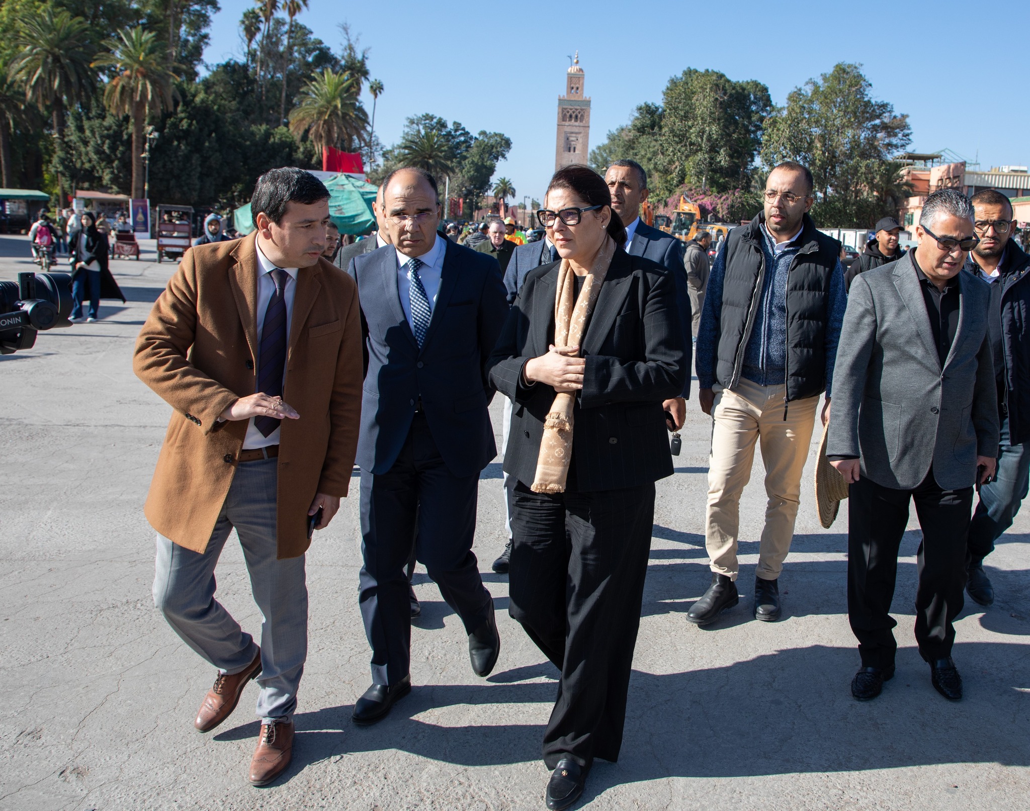 Mme Fatim Ezzahra EL MANSOURI, Présidente du Conseil communal de Marrakech, a suivi, accompagnée du premier vice président délégué au secteur des travaux, M. Mohamed IDRISSI, ainsi que des cadres de la commune, les travaux de réhabilitation et de valorisation de la place Jemaa el-Fnaa.