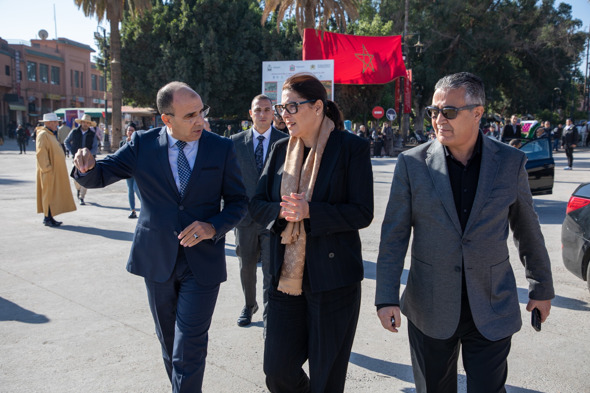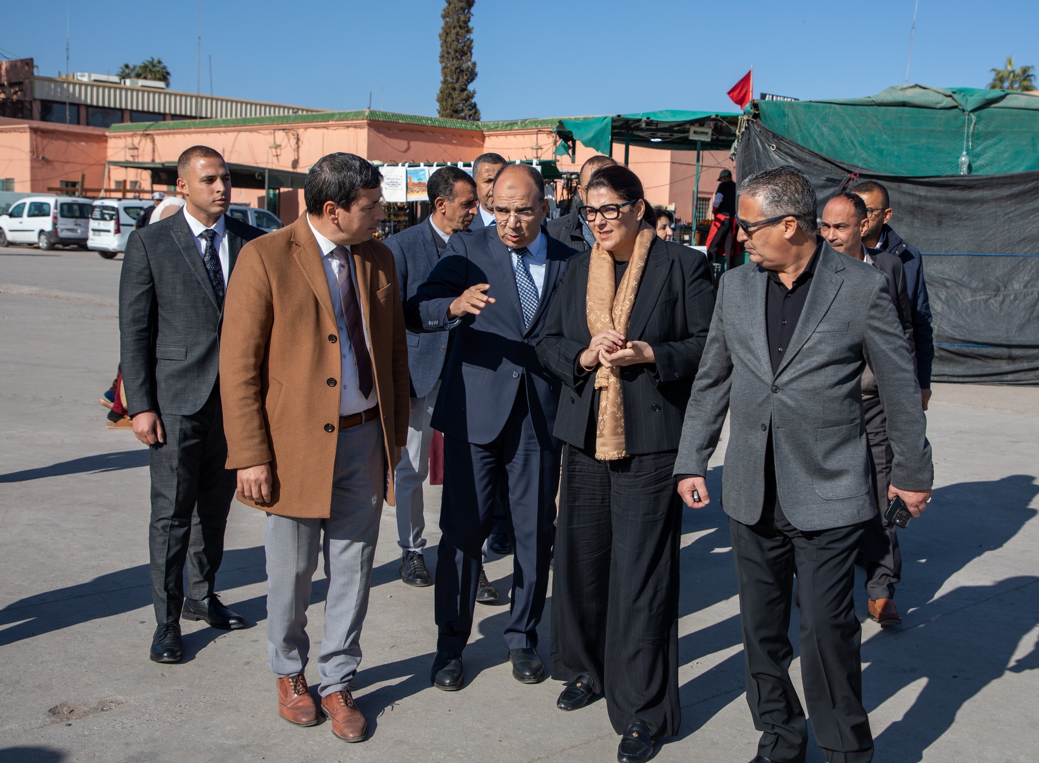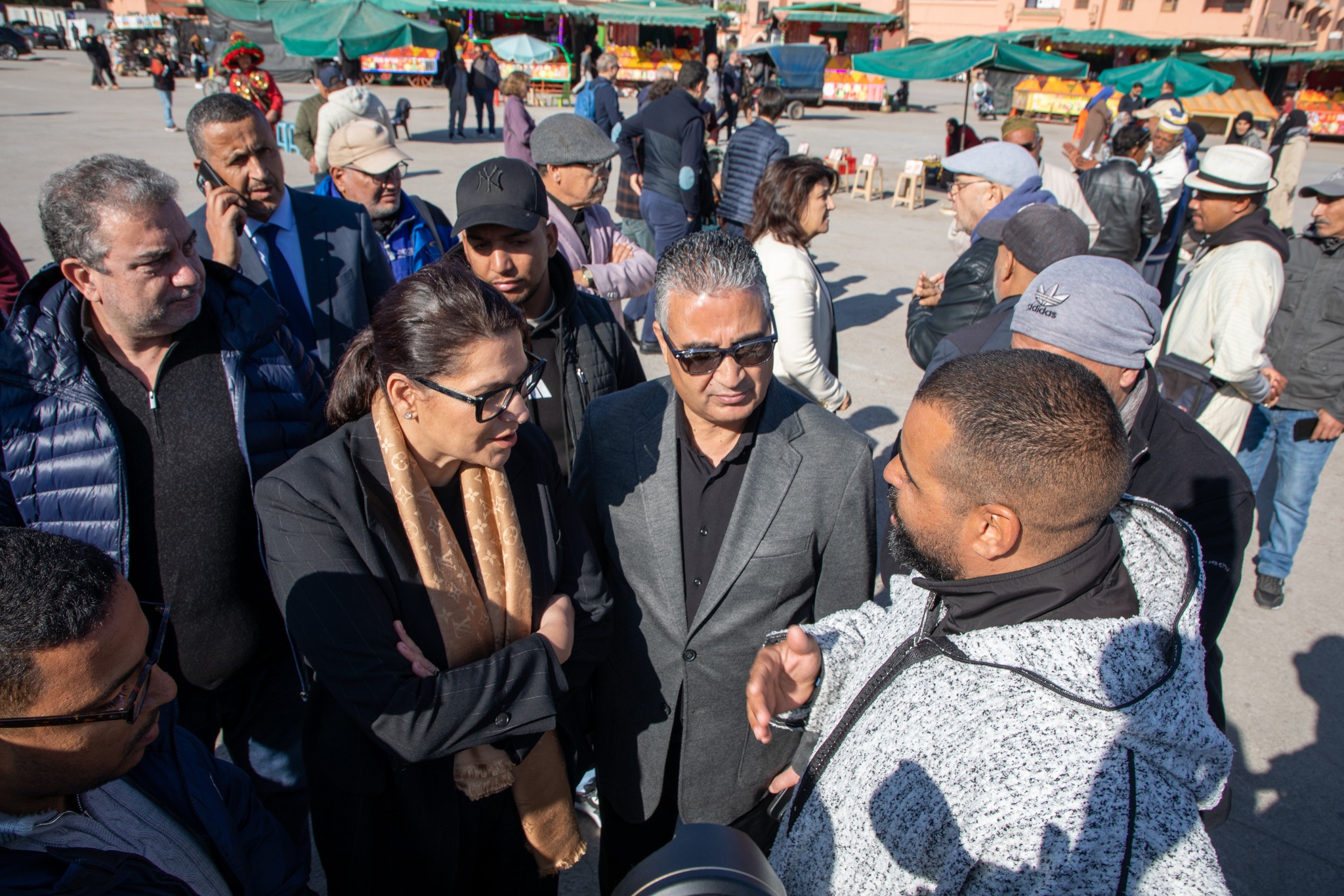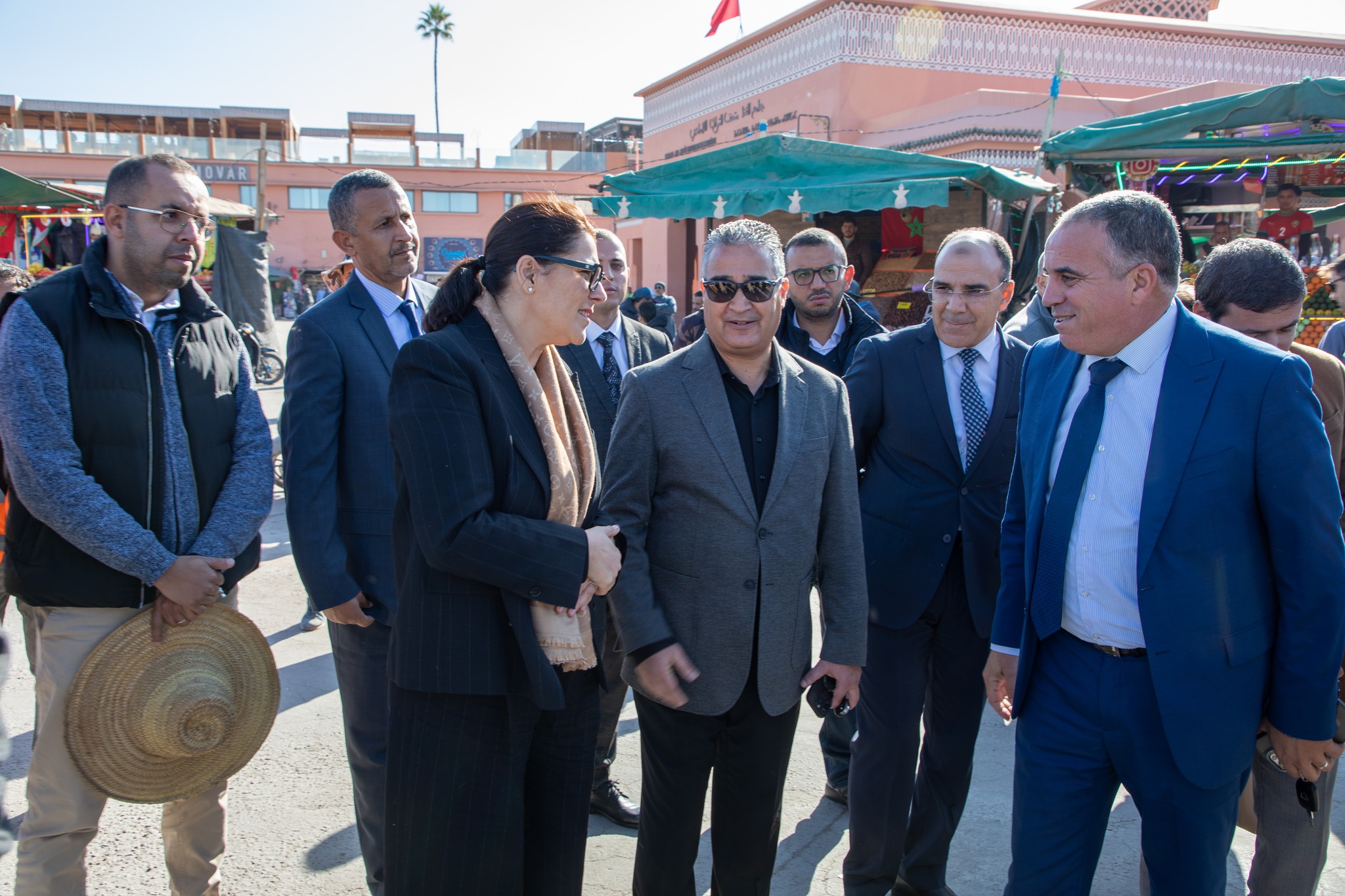 Mme Fatim Ezzahra EL MANSOURI, Présidente du Conseil communal de Marrakech, a suivi, accompagnée du premier vice président délégué au secteur des travaux, M. Mohamed IDRISSI, ainsi que des cadres de la commune, les travaux de réhabilitation et de valorisation de la place Jemaa el-Fnaa.